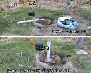 で、注水式ポールスタンドをつるはしで取り除きポール(塩ビパイプ)は地面に穴を掘