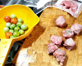 | 青ミニトマトに薄切り豚肉を捲く |
