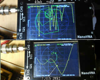 NanoVNAでSWRを見ると7は2以下,14は3以下で2.5以下にしたいところですが出力3Wです